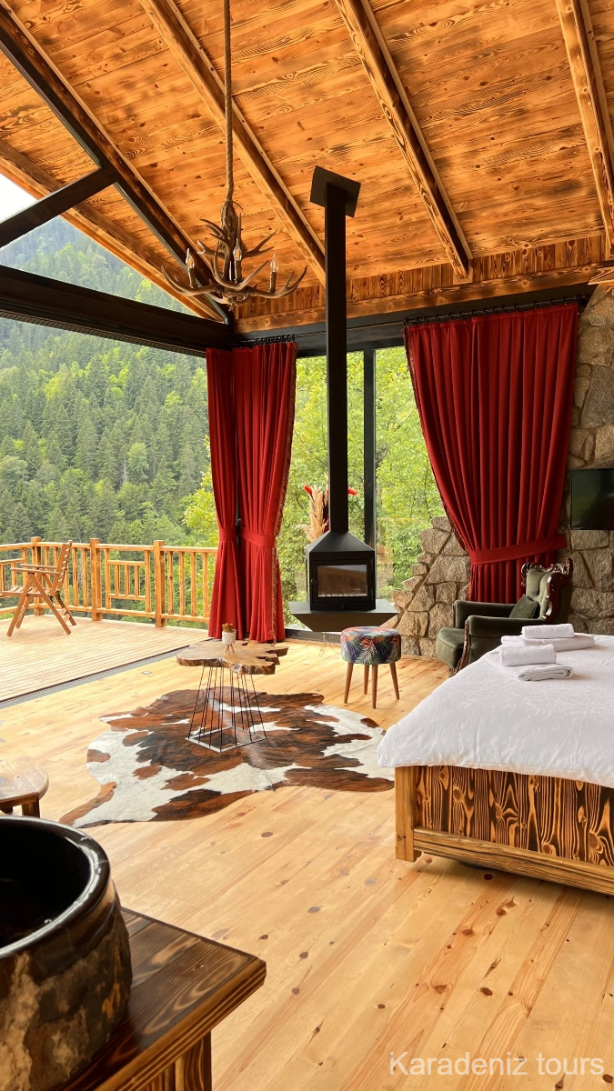 Bungalovumuz Çamlıhemşin’in eşsiz doğasıyla bütünleşerek misafirlerine unutulmaz bir konaklama deneyimi sunuyor. Yemyeşil ormanların içinde, kuş sesleri eşliğinde huzurlu bir tatil geçirmek isteyenler için özel olarak tasarlanan bungalovlarımız, şömine, jakuzili lüks iç mekânı ve geniş balkon alanlarıyla konforu zirveye taşıyor.