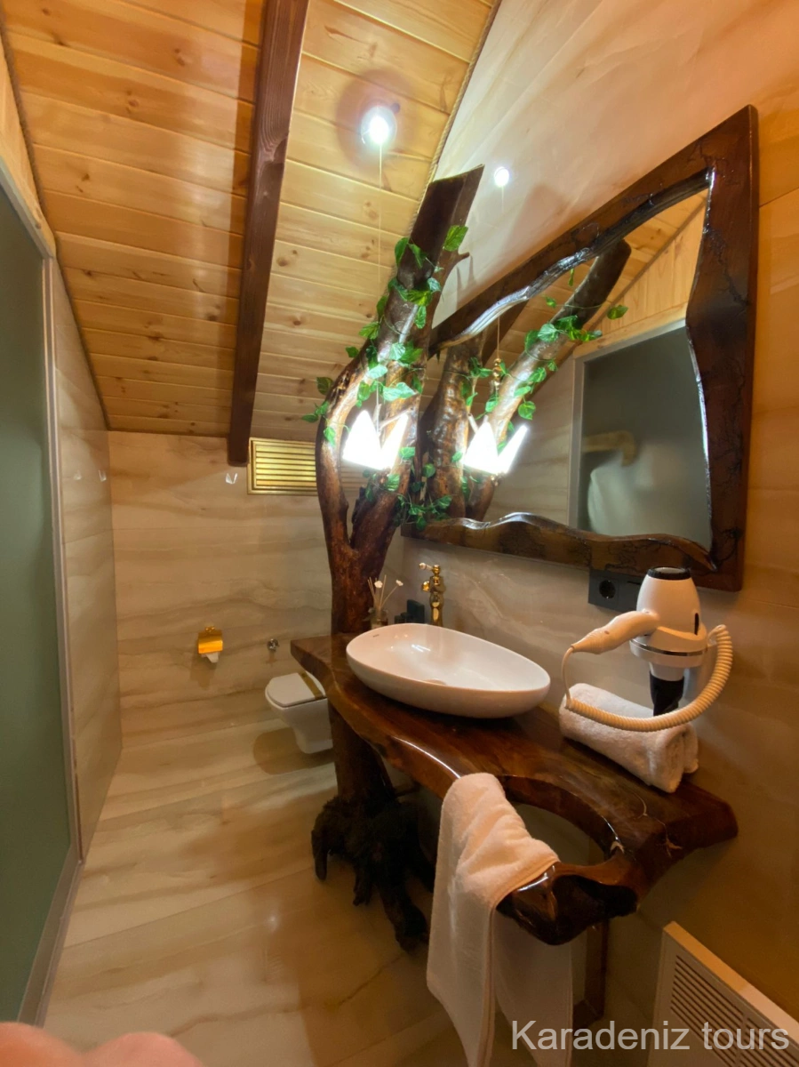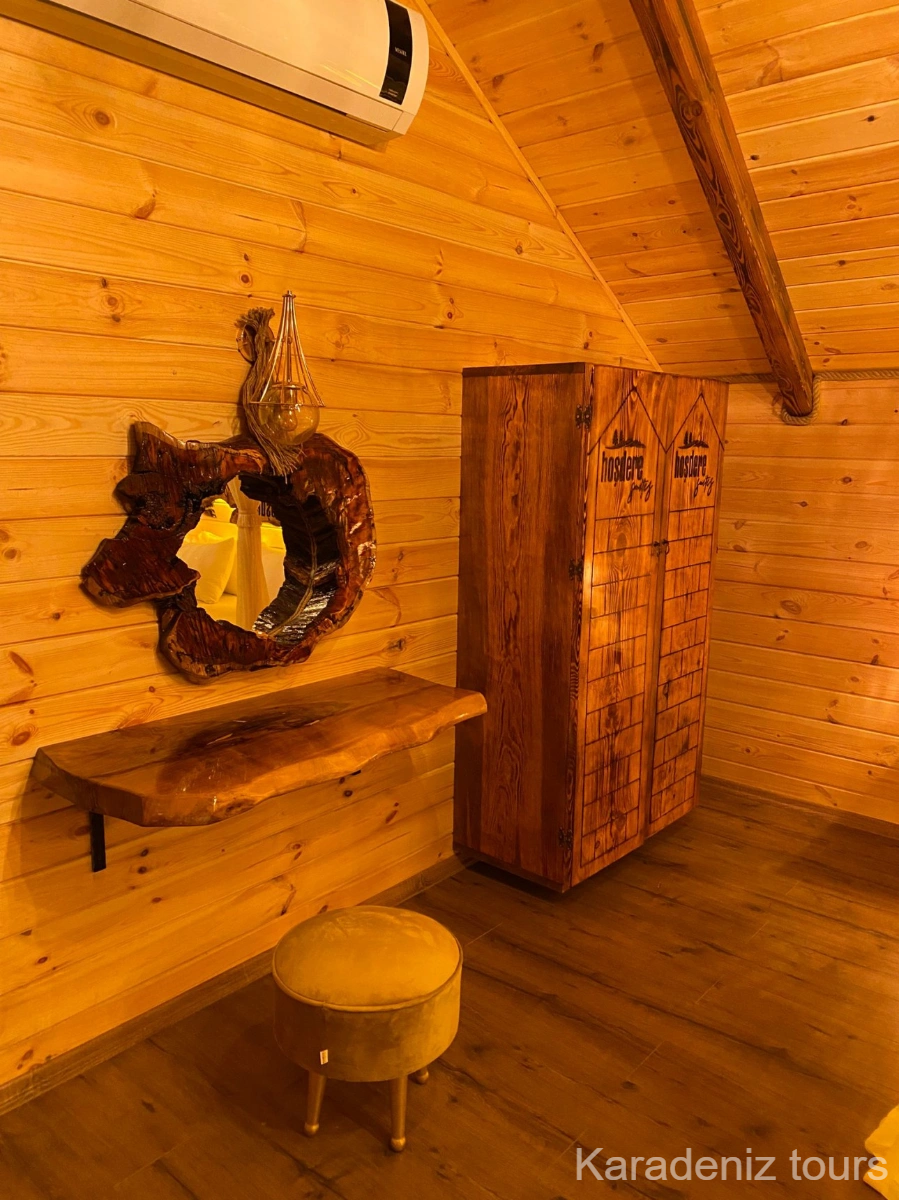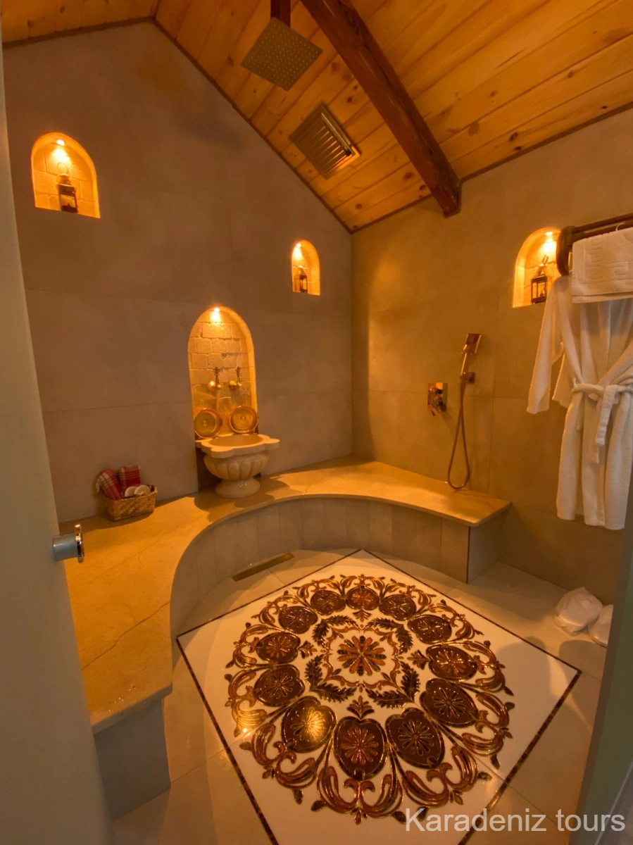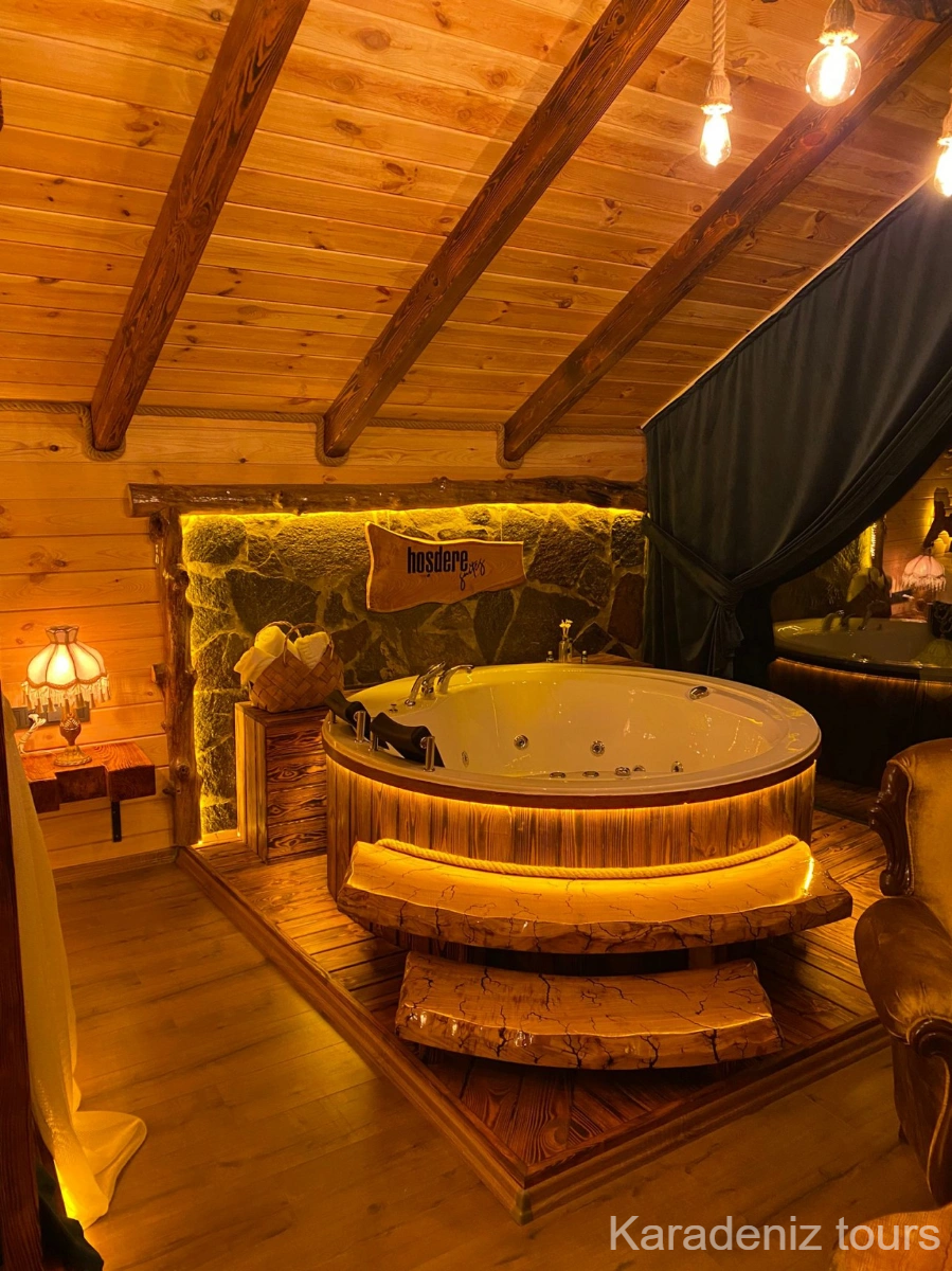 Bu odanın ayırt edici üçlüsü olan jakuzi, şömine ve Türk hamamı; konaklamayı sıradan bir tatil konaklasından lüks ve kültürel bir deneyime dönüştürür. Bölgedeki bungalov tesislerinde bu üçlüyü bir arada bulmak gerçekten nadirdir.
