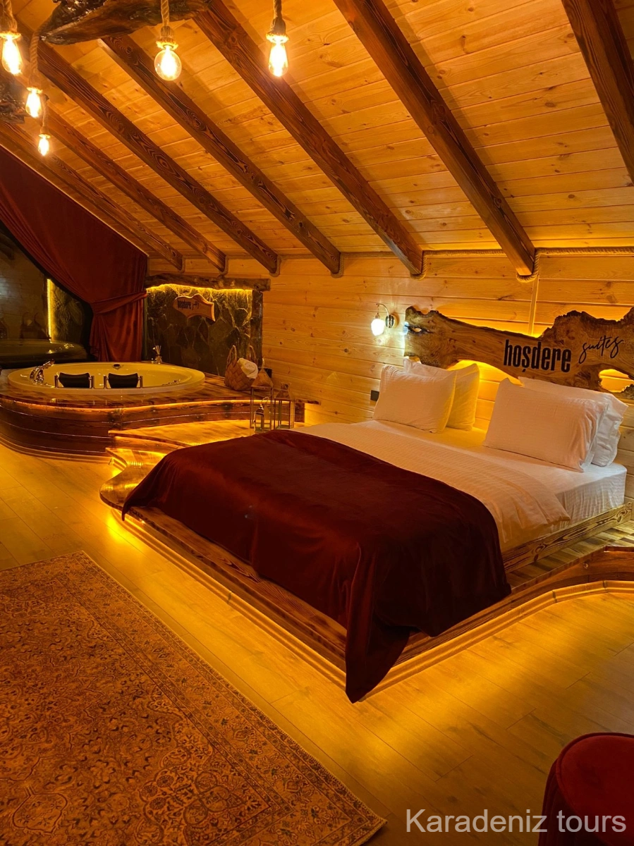 Rize'nin Çamlıhemşin ilçe merkezinde konumlanan Hoşdere Bungalov'un Sultan Bungalow odası, tesisin en geniş ve en donanımlı konaklama seçeneğidir. 75 m²'lik alanında 15 m²'lik özel Türk hamamı, jakuzi, şömine, Fırtına Deresi ve şehir manzaralı balkon, ücretsiz minibar ve oda kahvaltı servisiyle çiftlere gerçek anlamda premium bir bungalov deneyimi sunar. Rize premium bungalov, Çamlıhemşin 15 m² Türk hamamlı jakuzili oda, Karadeniz en büyük bungalov suite gibi aramalarda güçlü karşılık üretir.