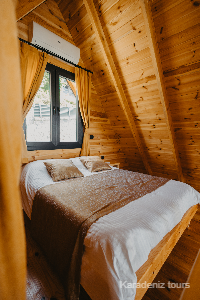 Lona Bungalow'un geniş ve ferah ahşap dizaynı, dışarıdaki doğanın huzurunu içeriye taşır. Dere ve orman manzarasına açılan veranda, sabah kahvesinden akşam serinliğine kadar her an keyifli bir açık hava alanı sunar.