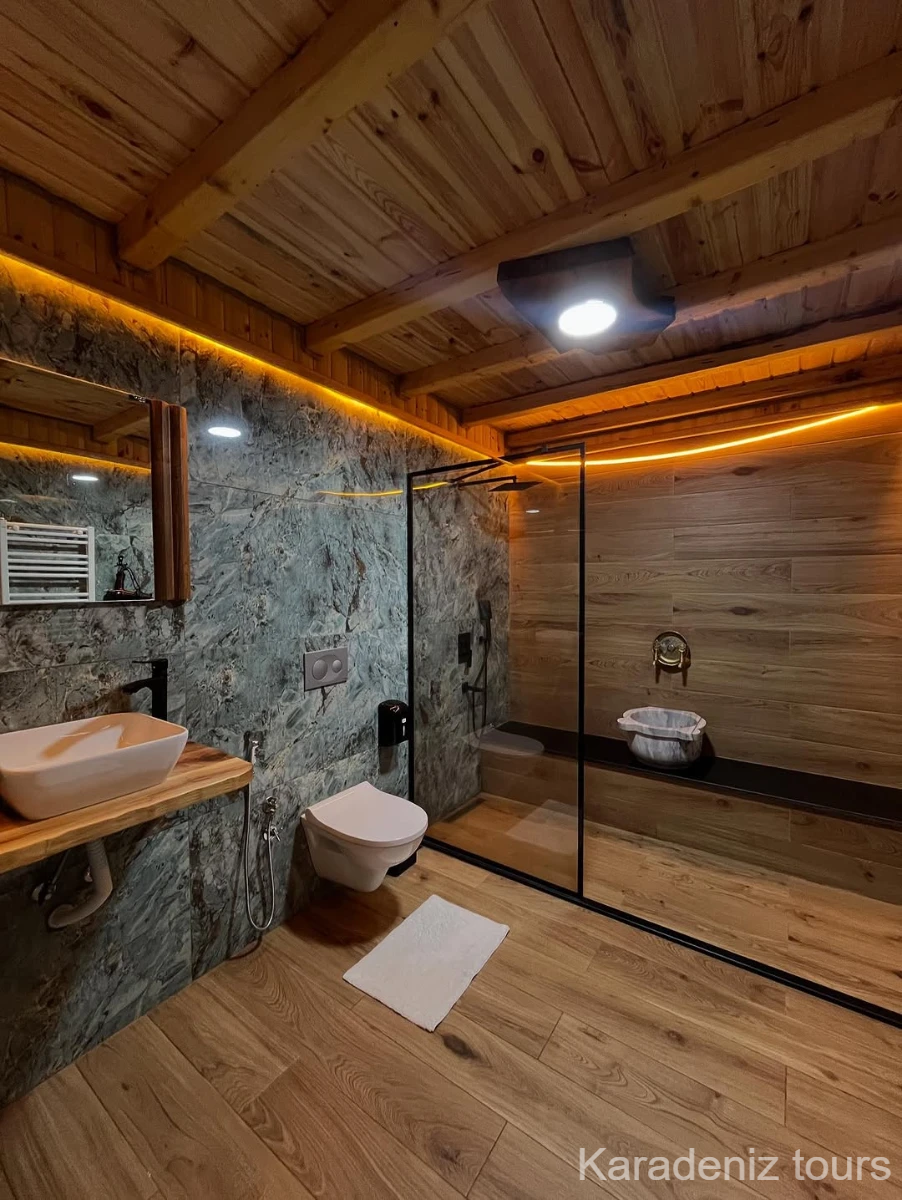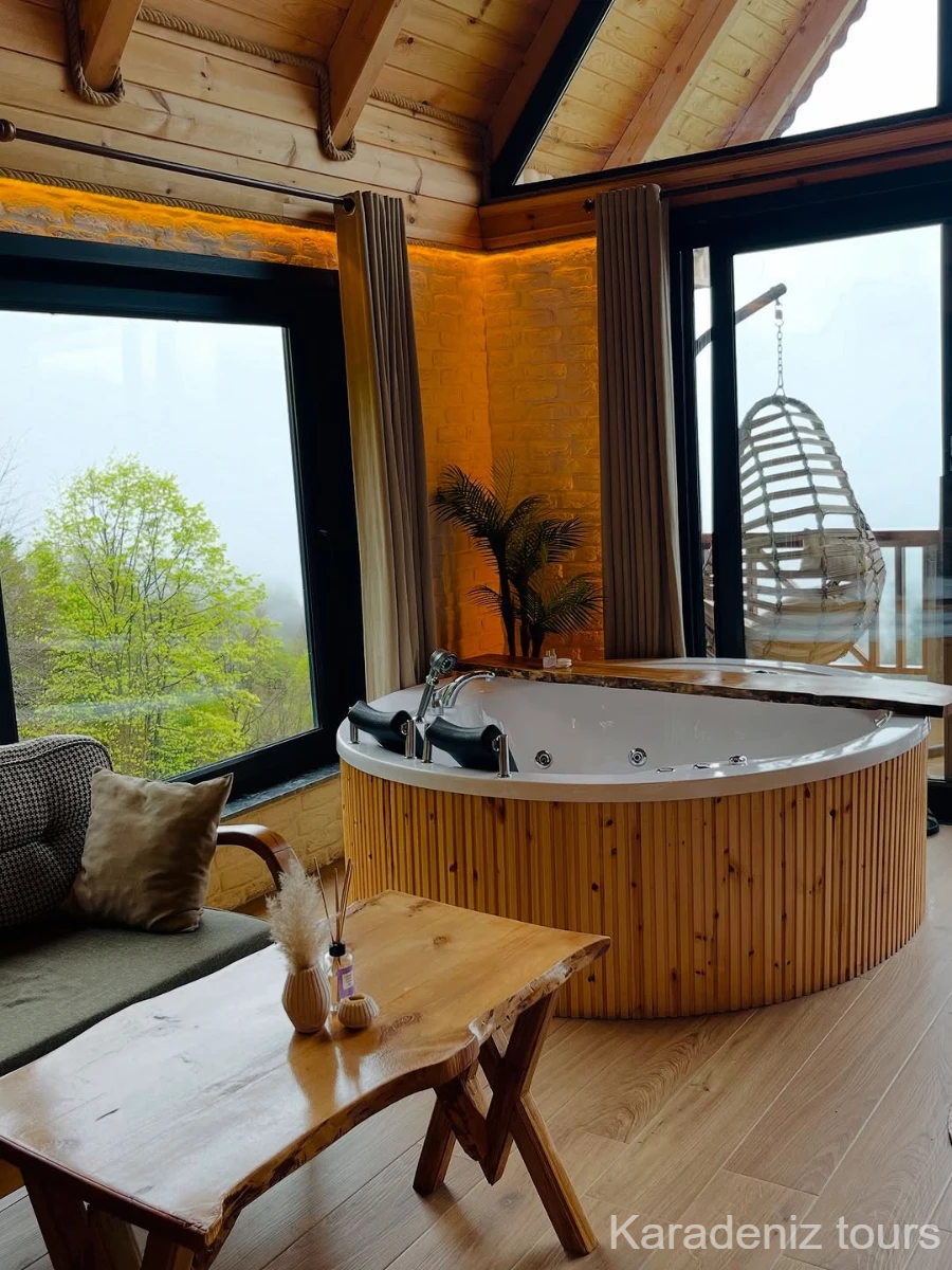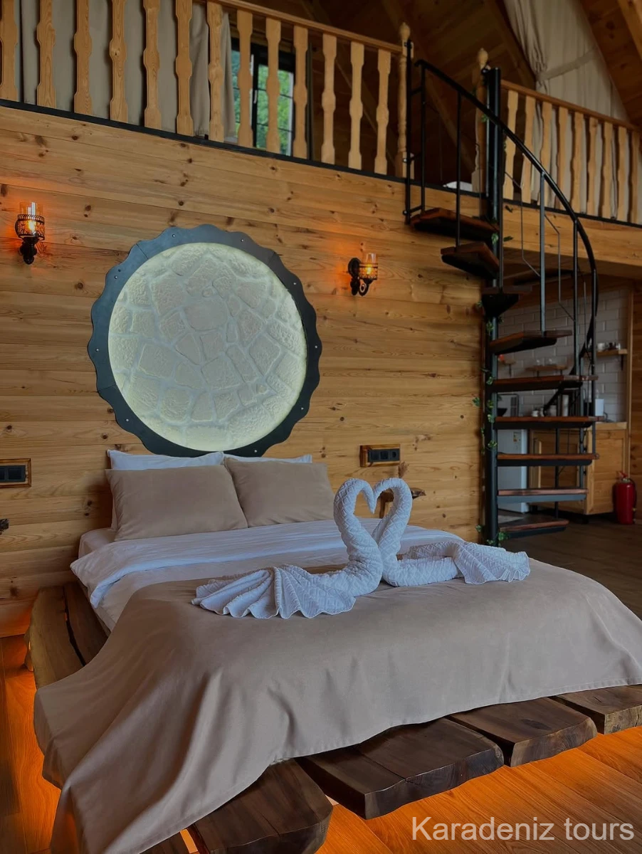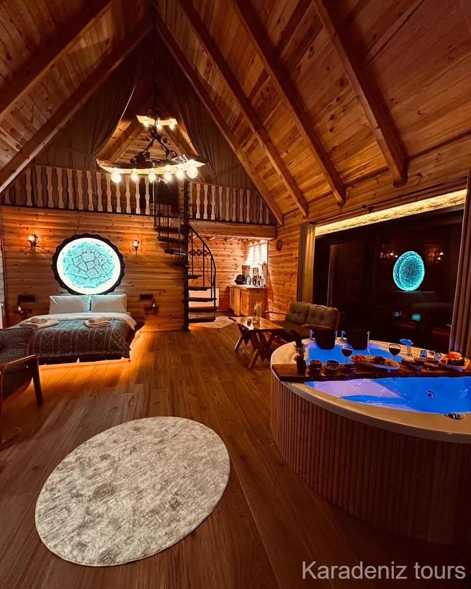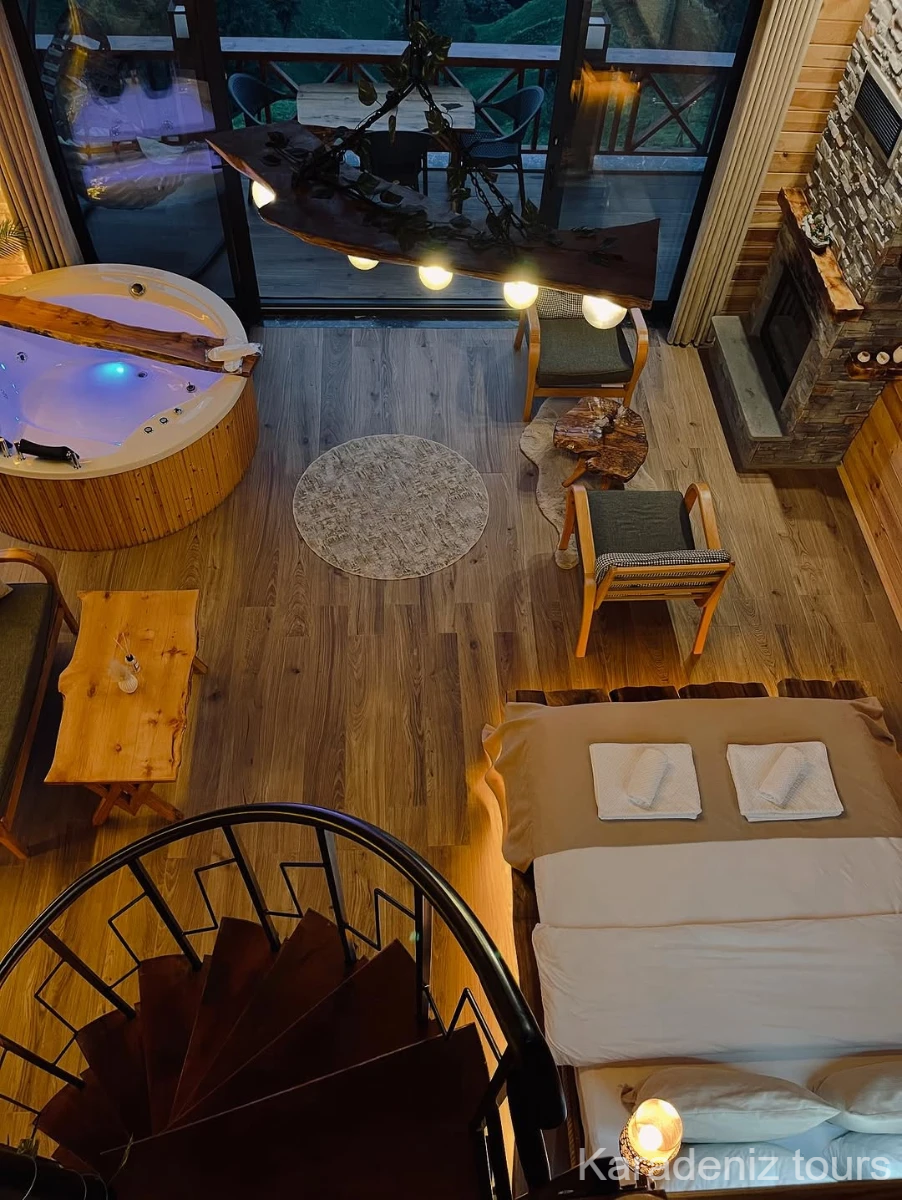 Mintona Villa Suit 103 Deluxe Bungalov, yalnızca konaklama sunan bir yer değil; çiftler için taş şöminenin gerçek ateş ışığında, jakuzi keyfinde ve ahşabın sıcak dokusunda Karadeniz'in romantik atmosferini bütünüyle hissettiren özgün bir yaşam alanıdır.