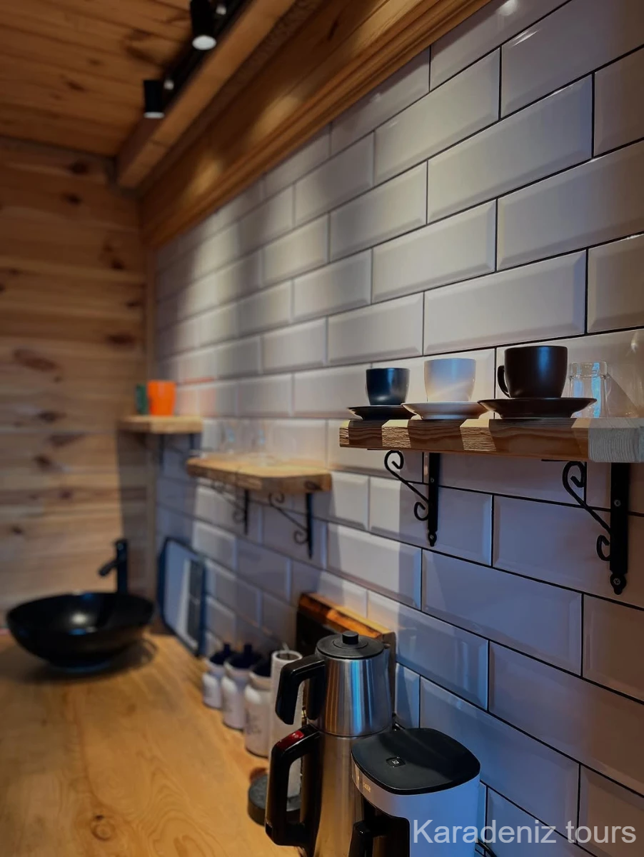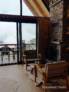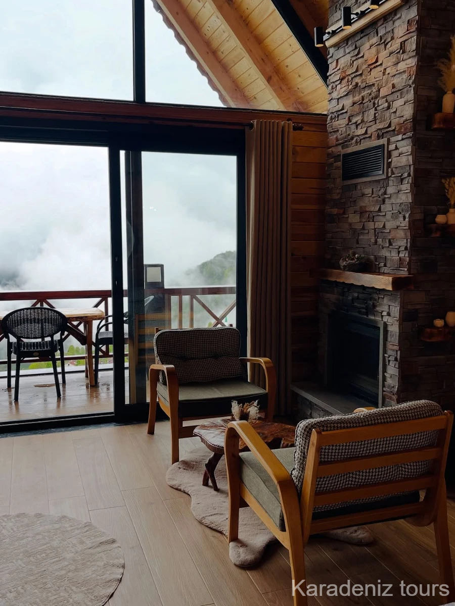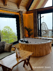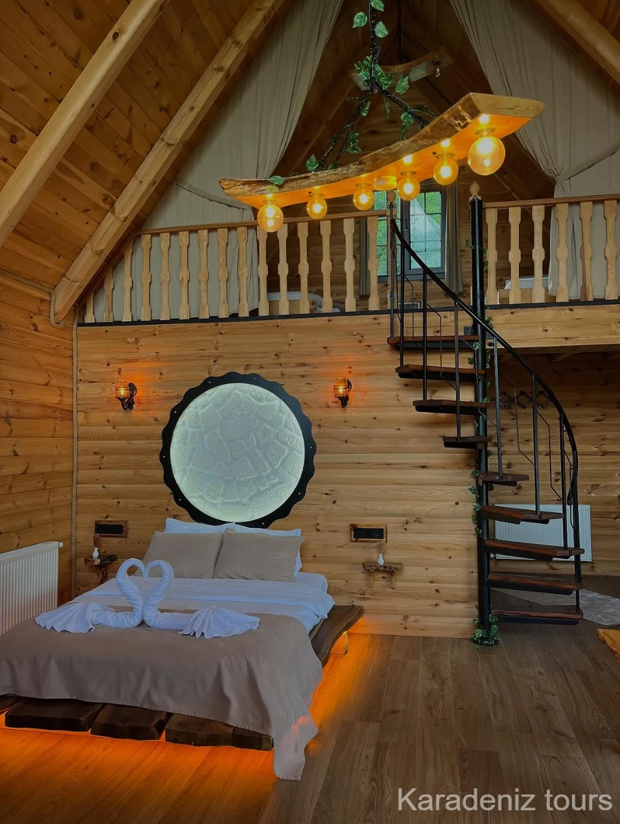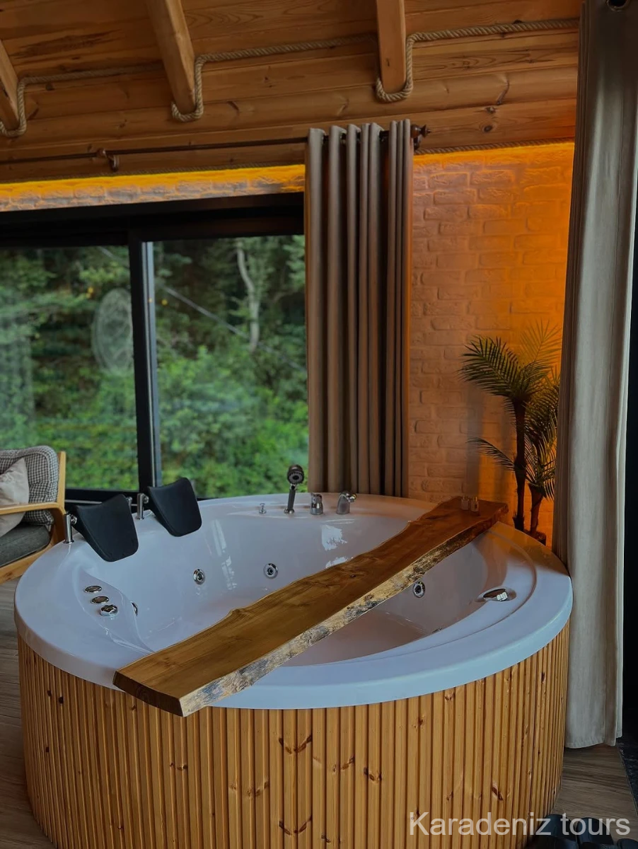 Mintona Villa Suit 103 Deluxe Bungalov, yalnızca konaklama sunan bir yer değil; çiftler için taş şöminenin gerçek ateş ışığında, jakuzi keyfinde ve ahşabın sıcak dokusunda Karadeniz'in romantik atmosferini bütünüyle hissettiren özgün bir yaşam alanıdır.