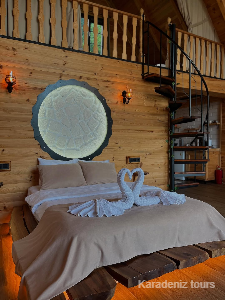 Açık ahşap tavan kirişleri odaya geleneksel Karadeniz dağ evi ruhunu katar. Tüm bu unsurlar bir araya geldiğinde 103 numaralı oda, Mintona Villa Suit'in en özgün ve en romantik konaklama deneyimini sunar.
