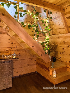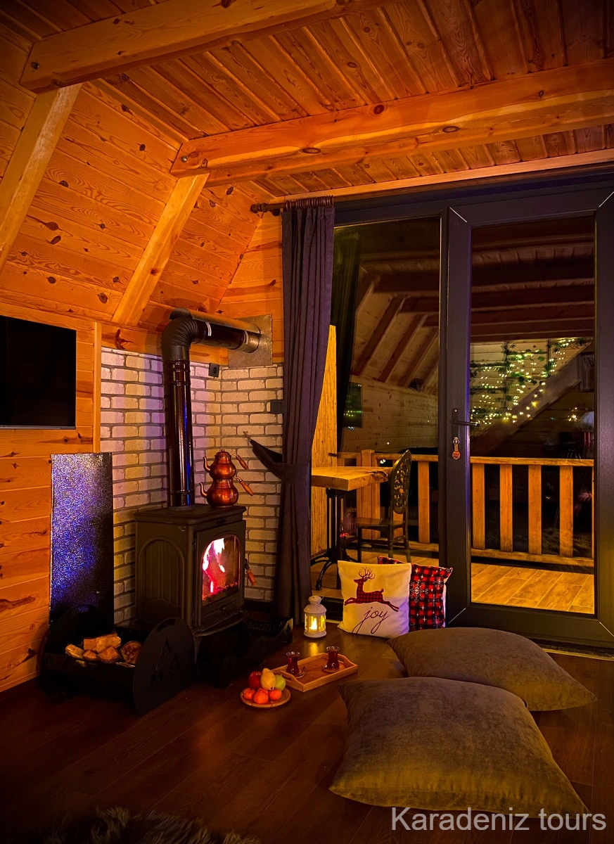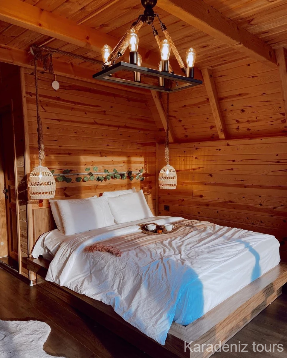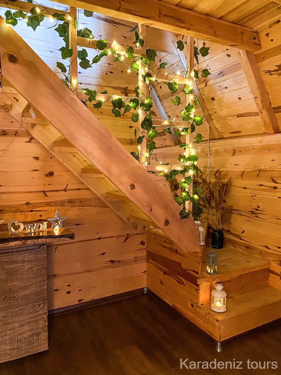 Ferah Dubleks Yaşam: No:102, geniş iç hacmiyle sıkışık hissetmek istemeyenler için ideal. Alt katta şömine başında keyif yaparken, üst katta vadi manzarasına uyanmanın lüksünü yaşarsınız. Rize dubleks bungalov arayan aileler ve çiftler için mükemmel genişlikte.