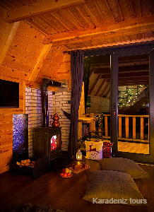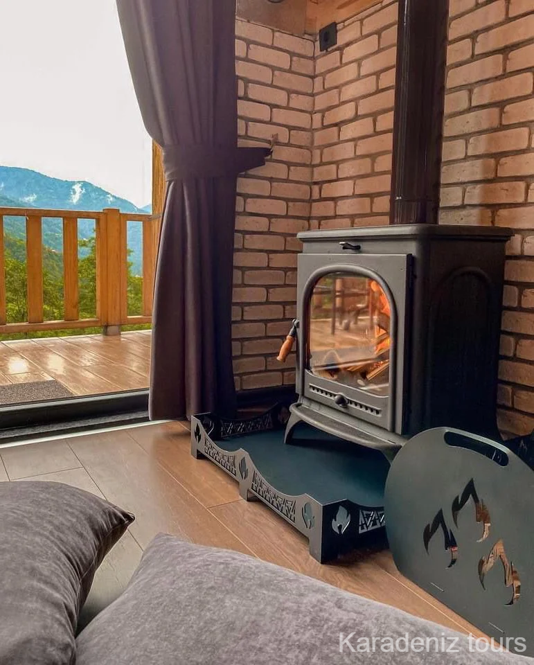 Romantik ve Sıcak: Taş duvarların arasındaki şömine soba, kış akşamlarında odayı sıcacık bir yuvaya dönüştürür. Jakuzi keyfinize eşlik eden bu sıcak atmosfer, balayı çiftleri için unutulmaz anılar biriktirir.